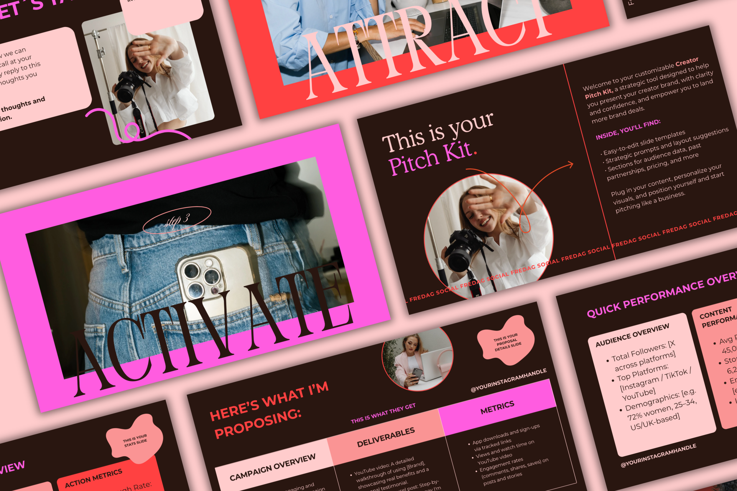 The Creator Pitch Kit gives you a professional framework that shows brands you mean business. Instead of scrambling to put together pitches or guessing what brands want to see, you get a ready-made, customizable deck that highlights: